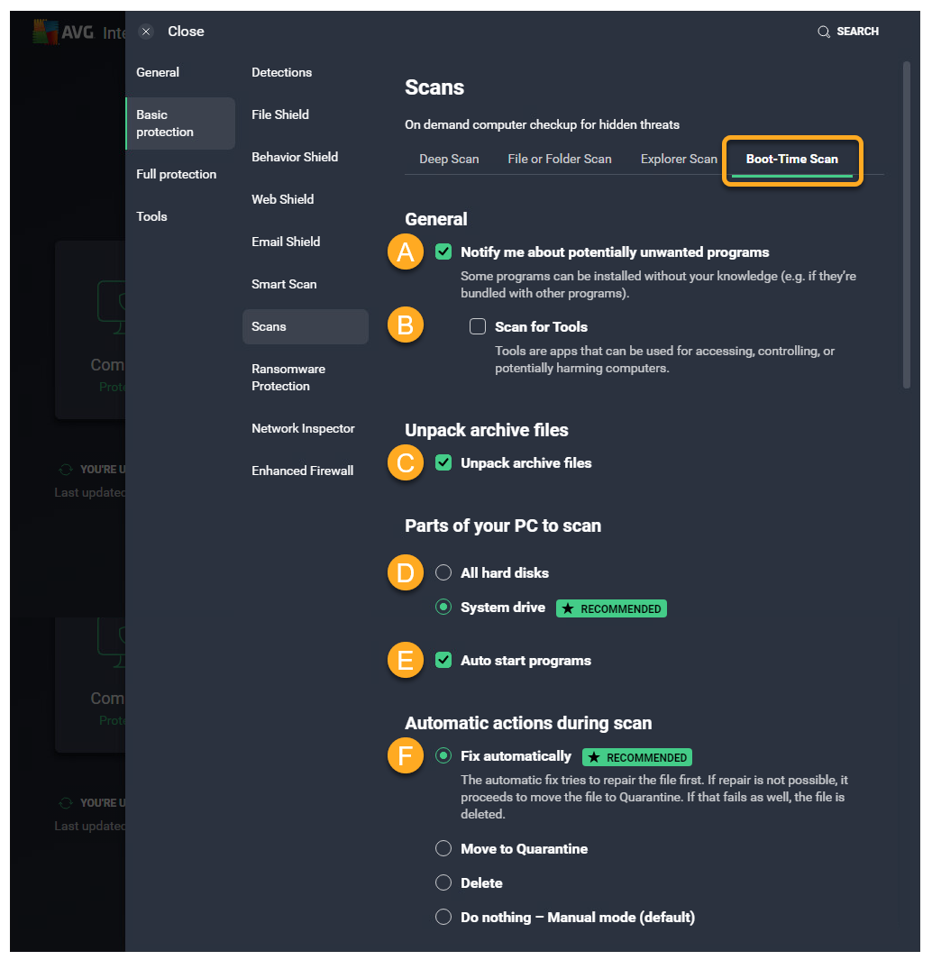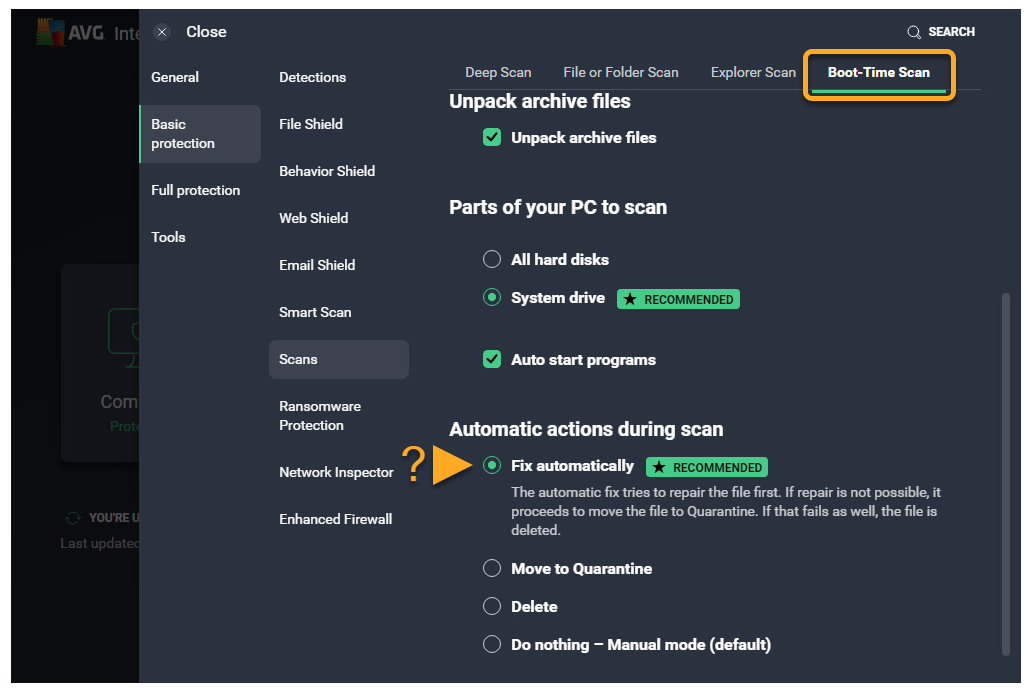 - Automatické akce během testů: Nastavte automatické akce pro jakékoli hrozby nalezené Testem po restartu.