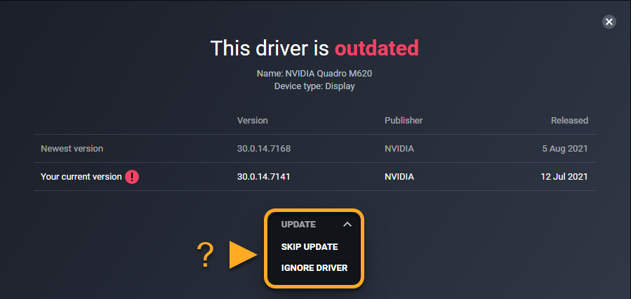 - Přeskočit aktualizaci: AVG Driver Updater neaktualizuje ovladač na novou verzi. Až bude k dispozici další aktualizace, znovu se vás zeptá, jestli dotyčný ovladač chcete aktualizovat.
