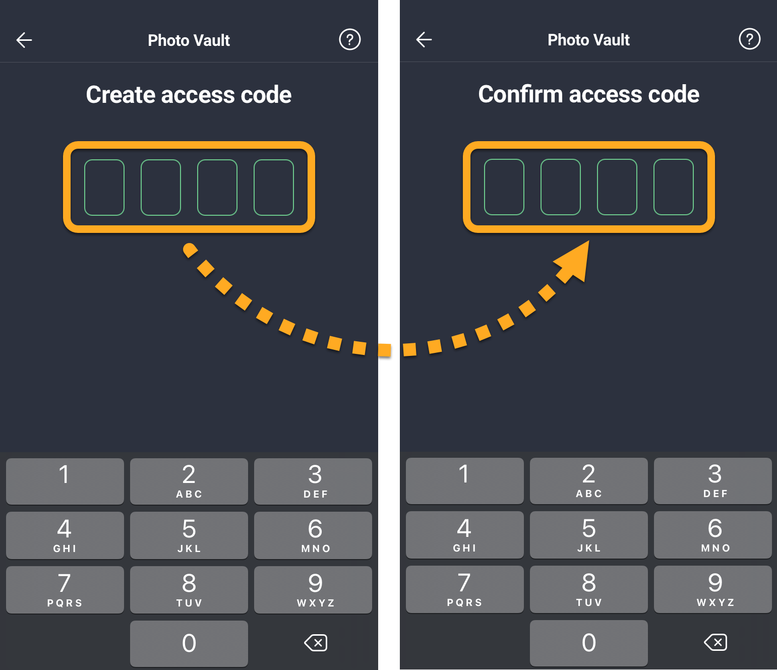 - Vytvořte čtyřmístný přístupový kód, pomocí kterého se k Foto trezoru budete přihlašovat. Zadejte ho dvakrát, abyste ho potvrdili.
