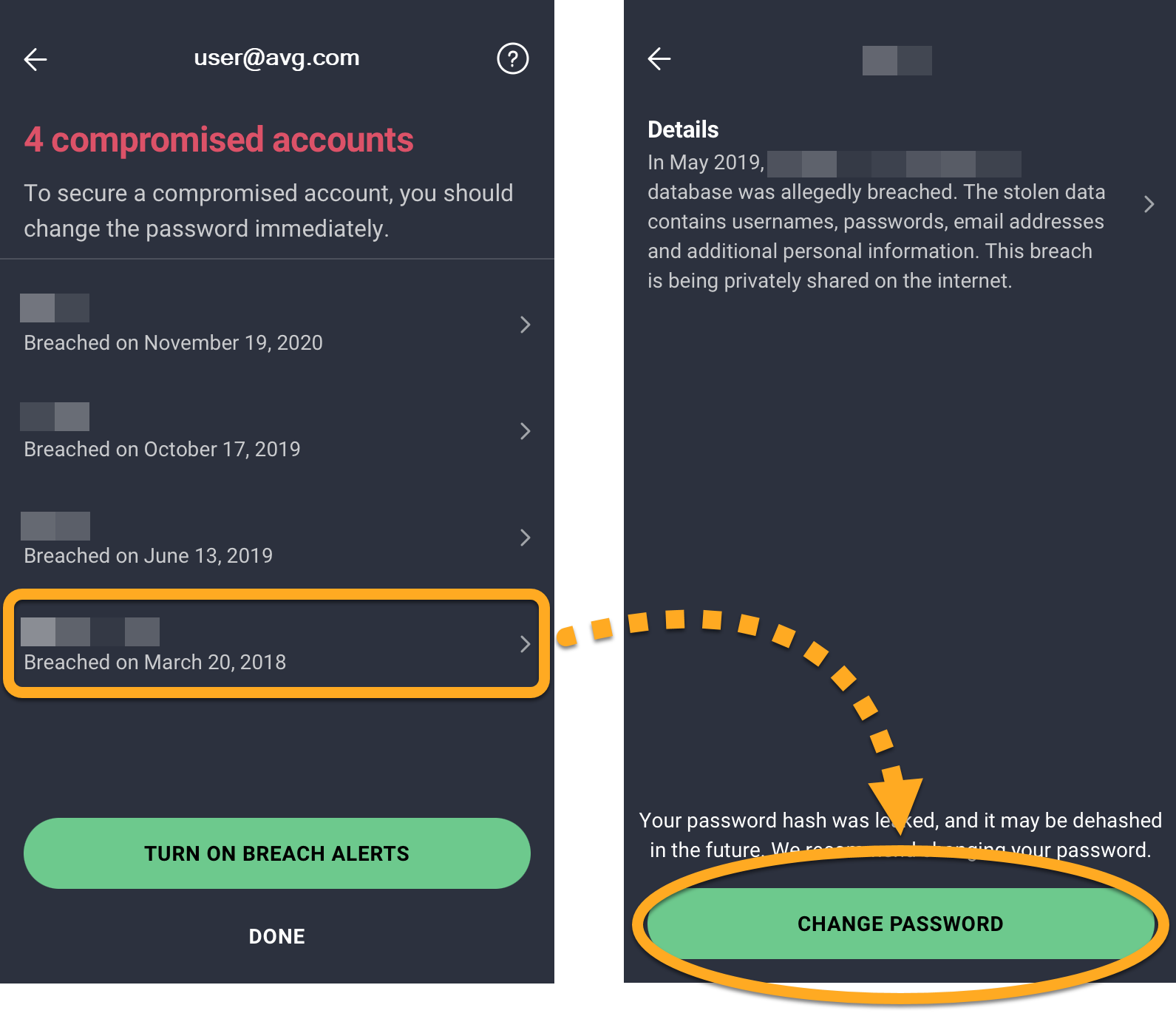 - Vyzrazené účty: Zjistili jsme, že přihlašovací údaje k nejméně jednomu vašemu účtu unikly na internet. Na všech účtech uvedených mezi účty s ohroženým zabezpečením vám doporučujeme neprodleně si změnit heslo. Klepněte na účet, kterého se únik dat týkal, a pak klepněte na Změnit heslo a podle pokynů na obrazovce změňte heslo k účtu.