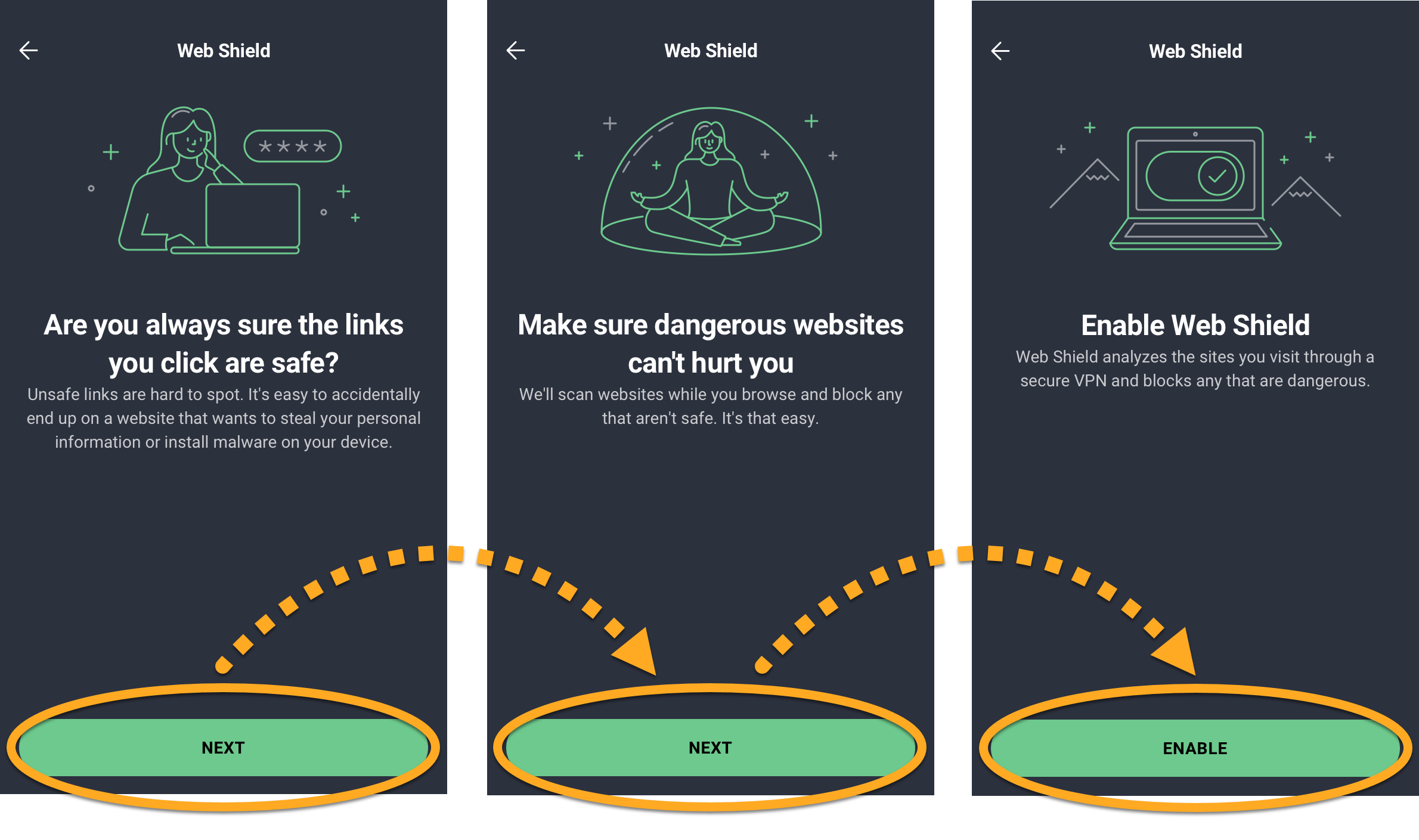 Webový štít běží na pozadí, zatímco procházíte internet. Pokud je Webový štít zapnutý, blokuje AVG Mobile Security falešné weby, které se vás snaží ošálit napodobováním skutečných webů. K zapnutí této funkce je potřeba místní VPN (virtuální privátní síť). Jak zapnout Webový štít: