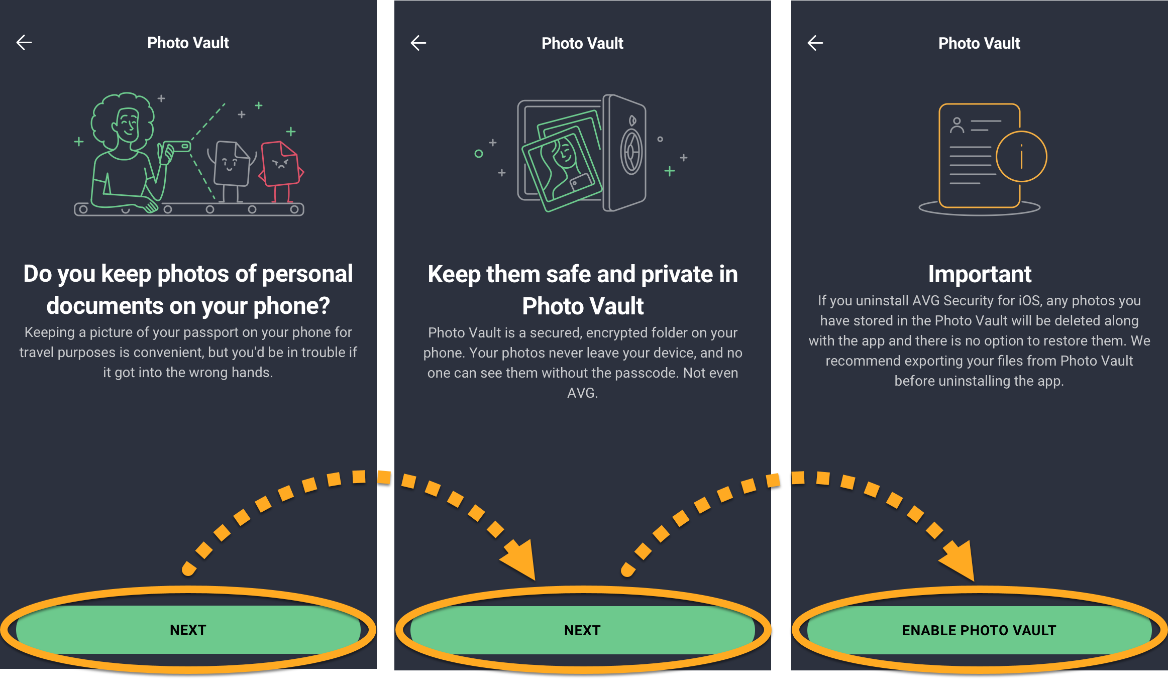 - Klepněte dvakrát na možnost Další, a poté klepněte na možnost Aktivovat Foto trezor.