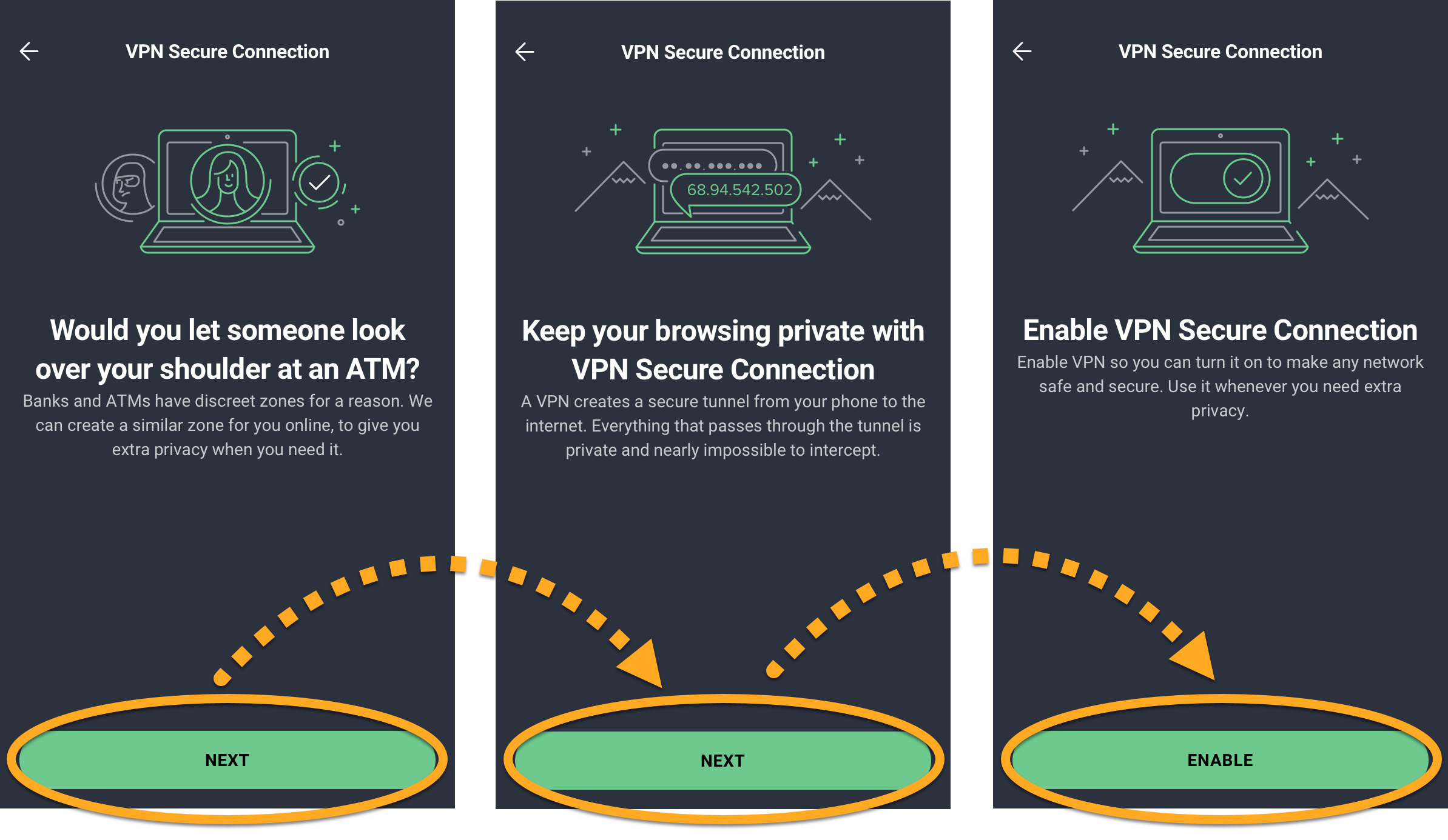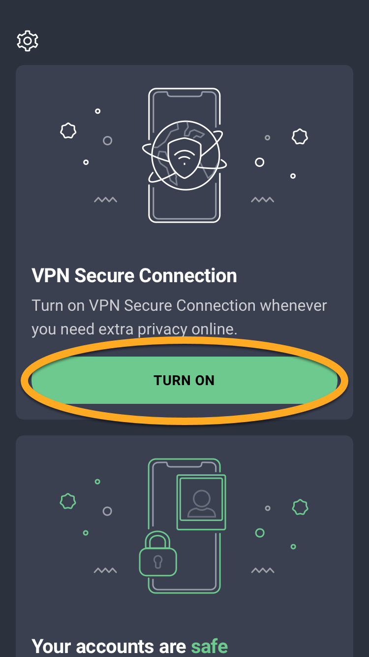Zabezpečené připojení přes VPN (dříve Ochrana na Wi-Fi síti) používá VPN (virtuální privátní síť), aby nikdo nemohl sledovat vaše online aktivity. Připojení přes VPN chrání datové přenosy mezi vaším zařízením a internetem, zabezpečuje data odesílaná z vašeho zařízení a anonymizuje vaše aktivity na internetu. Postup aktivace Zabezpečeného připojení přes VPN: