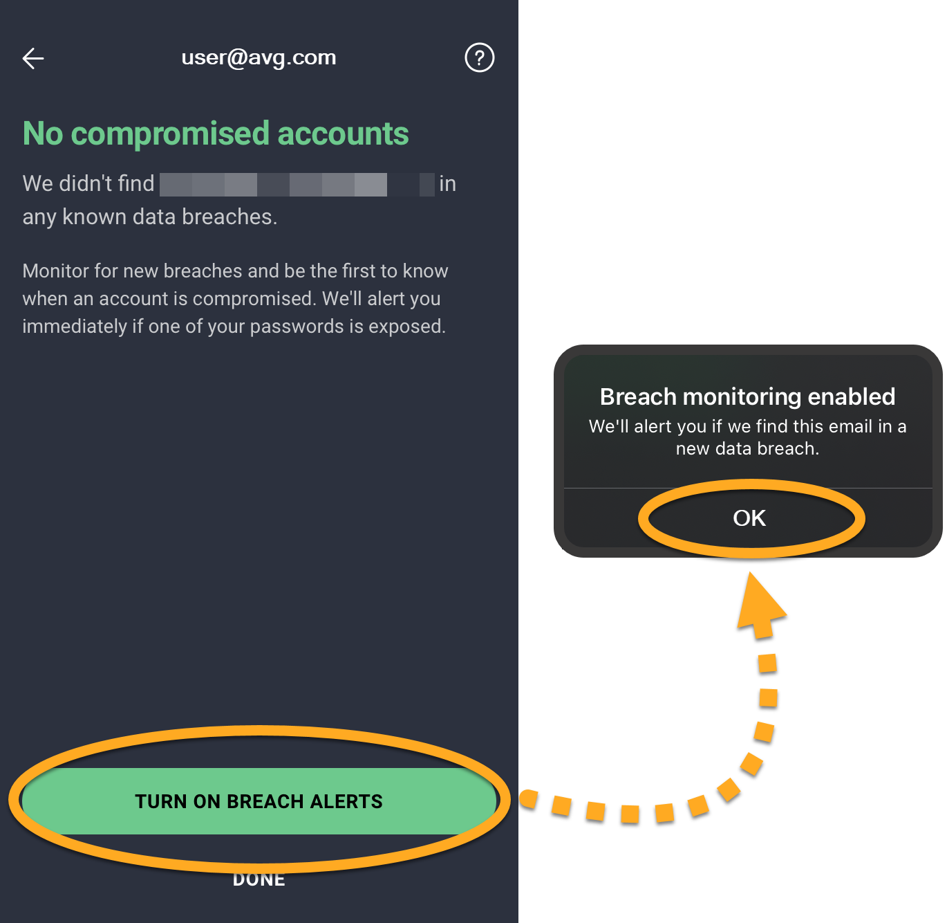 - Pokud chcete aktivně sledovat uniklá data související s vaší e-mailovou adresou, klepněte na Zapnout upozornění na porušení ▸ OK.