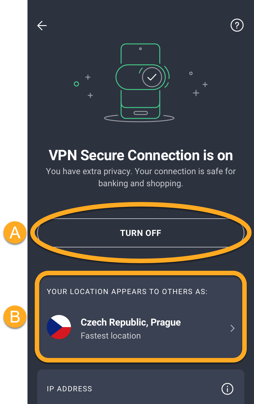 Zabezpečené připojení přes VPN je aktivované a připojené k nejbližší lokaci serveru.