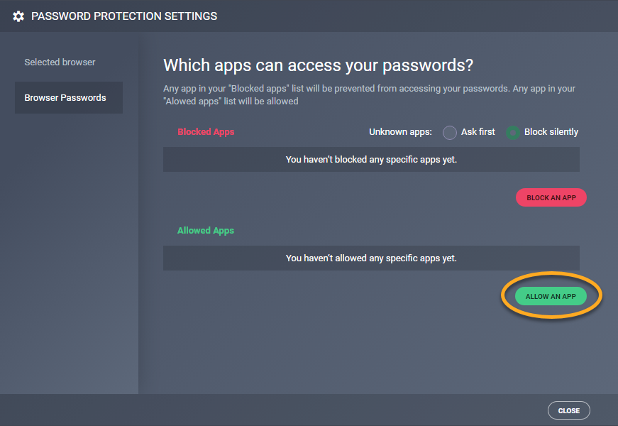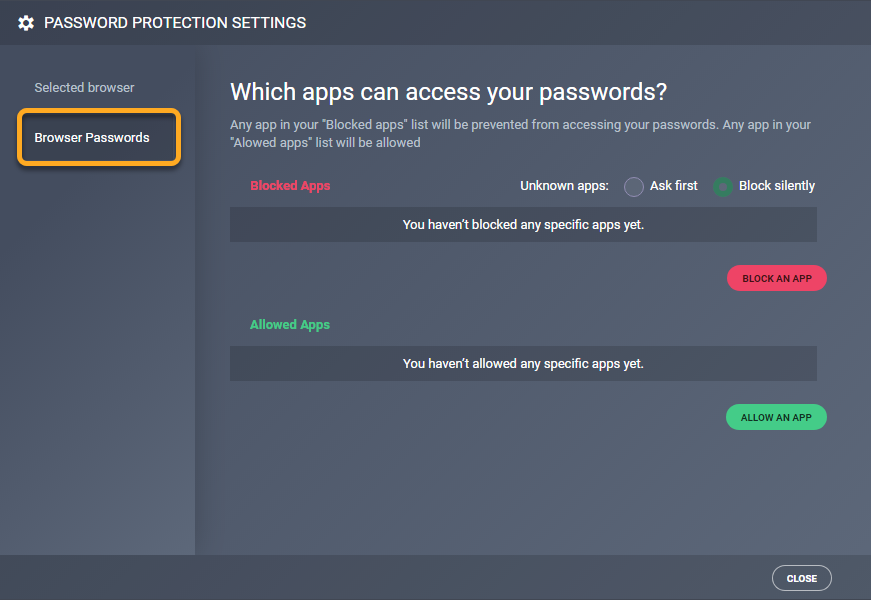 - Neznámé aplikace: Určete, jak se má AVG Password Protection chovat, když neznámá aplikace (aplikace, která není na seznamu blokovaných či povolených aplikací) pokusí o přístup k vašim heslům. Když vyberete možnost Tiše zablokovat, AVG Password Protection bude neznámé aplikace vždy automaticky blokovat. Když vyberete možnost Nejdřív se zeptat, AVG Password Protection vám pokaždé, když se nějaká aplikace pokusí o přístup k vašim heslům, zobrazí oznámení a zeptá se vás, zda ji chcete zablokovat, nebo povolit.