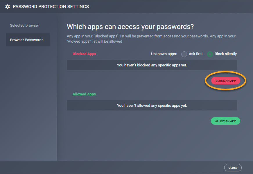 - Blokovat aplikaci: Slouží k přidání aplikace mezi blokované aplikace. Dotyčná aplikace bude při pokusu o přístup k vašim heslům automaticky zablokována.