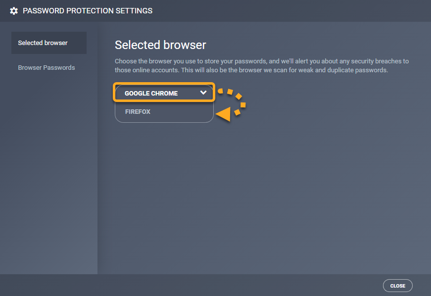 AVG Password Protection nedokáže chránit více prohlížečů najednou. AVG Password Protection ve výchozím stavu chrání váš výchozí prohlížeč (pokud jej podporuje). Vybraný prohlížeč můžete kdykoli změnit: