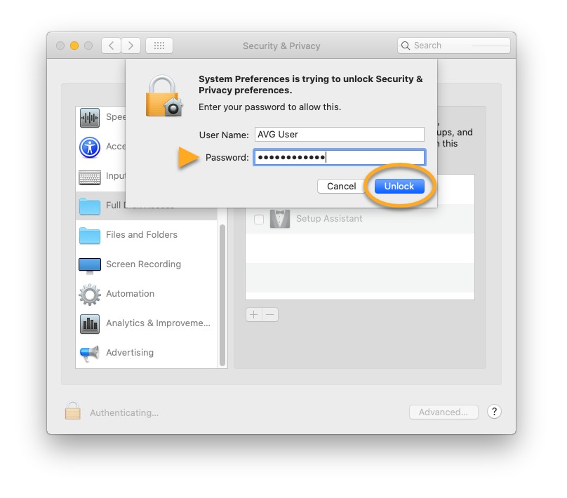 Wenn Sie macOS Mojave (10.14) oder höher verwenden und AVG AntiVirus oder AVG TuneUp Premium installiert haben, müssen Sie vollständigen Festplattenzugriff auf Ihrem Mac aktiviert haben, um sicherzustellen, dass Ihr AVG-Produkt einwandfrei funktioniert.