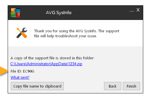 - Die Support-Datei wird automatisch an den AVG-Kundendienst geschickt, wenn Sie mit dem Internet verbunden sind. Notieren Sie sich Datei-ID und dessen Speicherort auf dem PC zur späteren Verwendung. Beim nächsten Kontakt mit dem AVG-Kundendienst können Sie den Mitarbeitern die Datei-ID nennen.