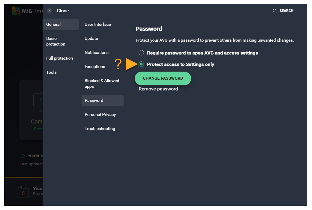 - Nur Zugriff auf Einstellungen schützen Aktiviert den Passwortschutz nur für den Zugriff auf die Einstellungen in AVG AntiVirus.