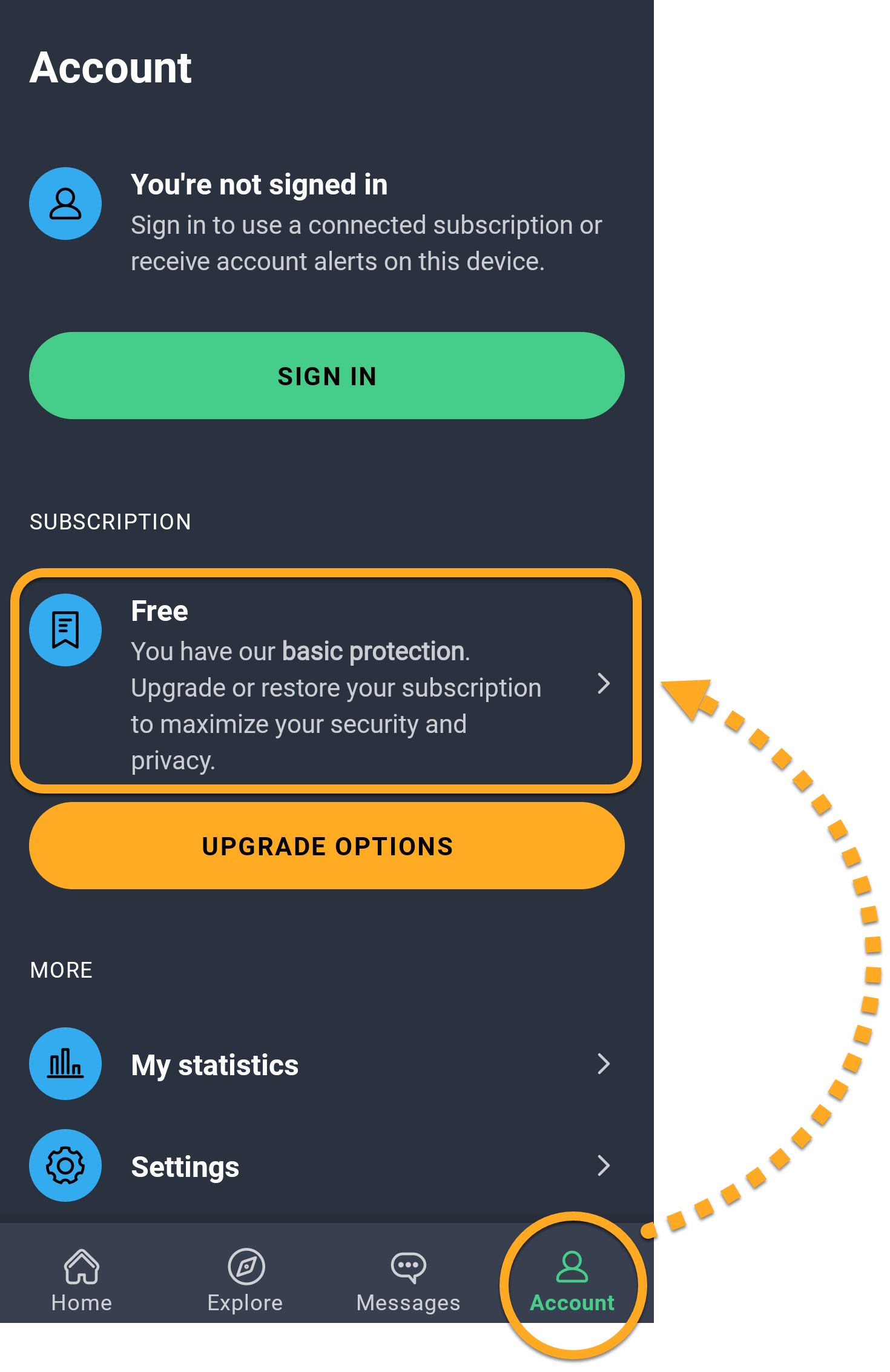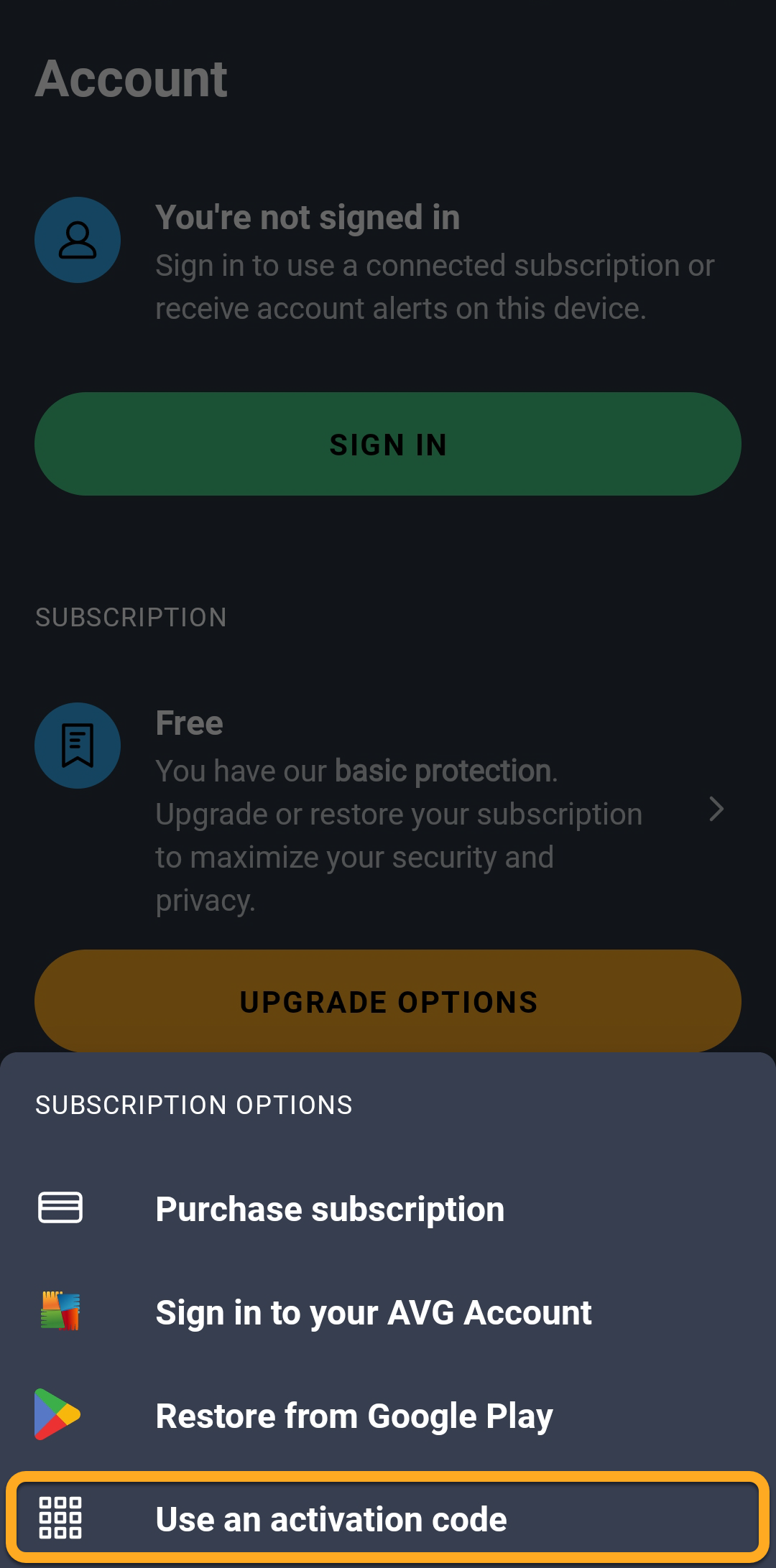 AVG AntiVirus is available as both a free and paid app. After you install the free version of the app, you may need to activate it. A subscription purchased via Google Play Store activates automatically on the device you use to make the purchase. If you purchase your subscription through another AVG sales channel, such as the AVG Store, you need to manually activate the app using a valid activation code or your AVG Account.