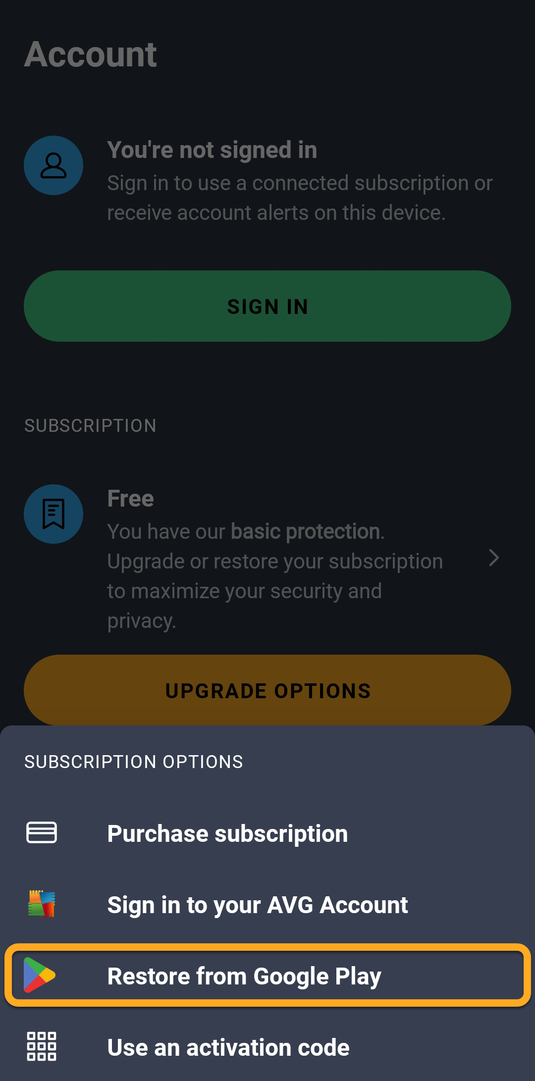 This option only applies if you purchased your AVG AntiVirus subscription through Google Play Store.