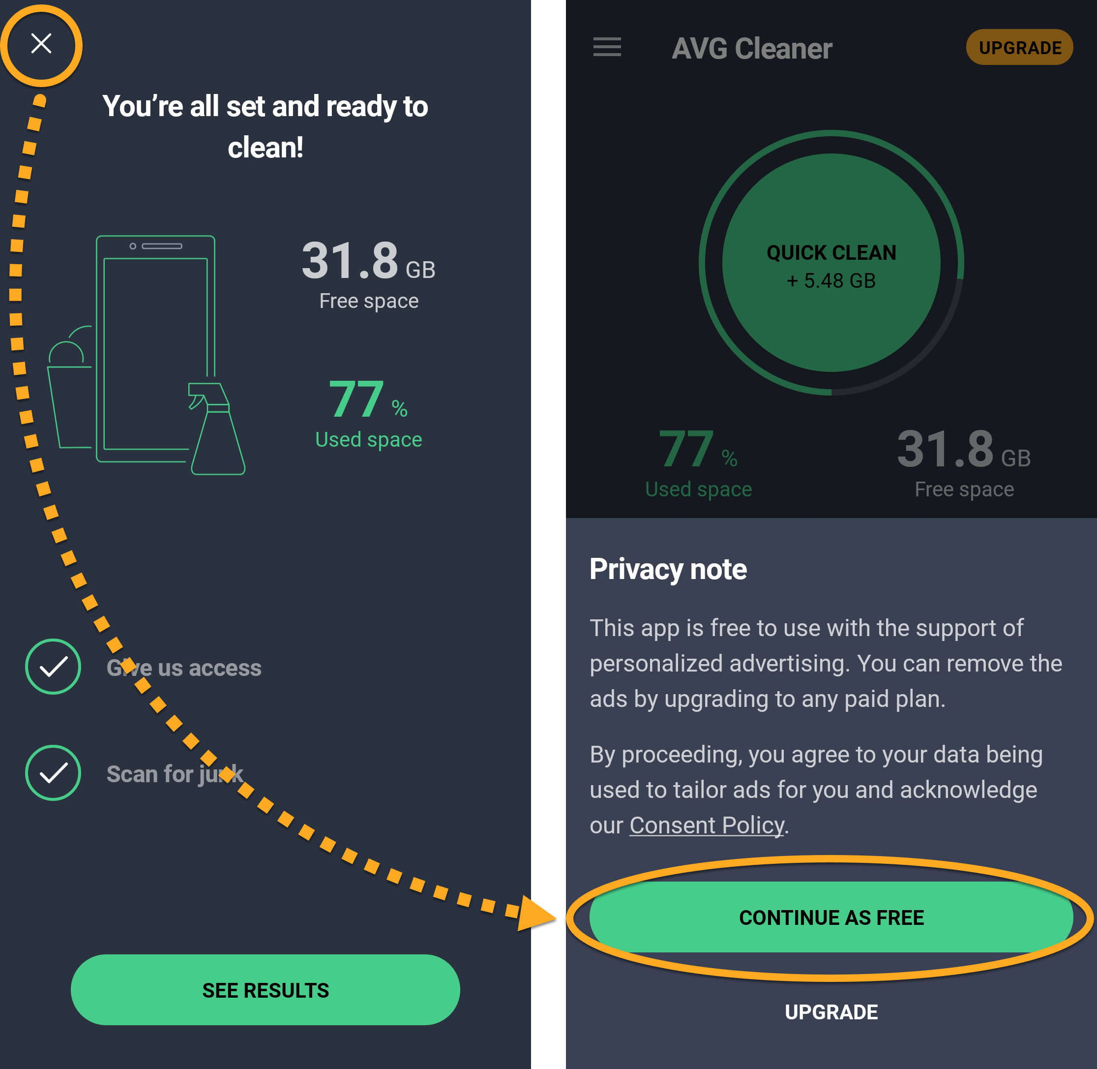You can purchase an AVG Cleaner Premium subscription by tapping Upgrade in the top-right corner of the main app screen. Follow the on-screen instructions to complete the purchase via Google Play Store.