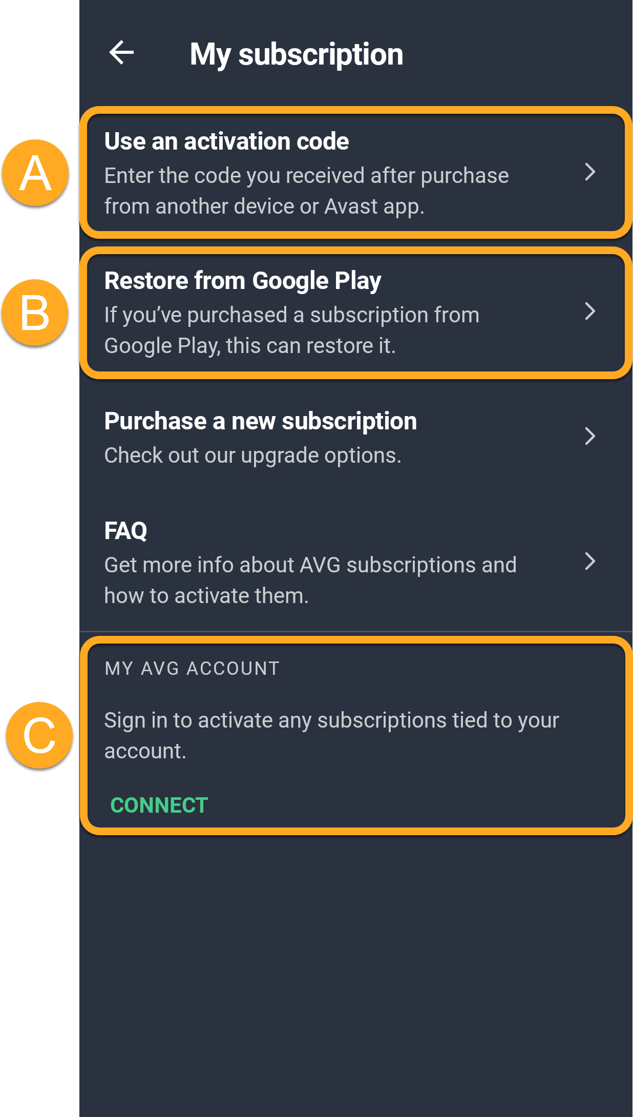 - My AVG Account: Connect your subscription using your AVG Account credentials.