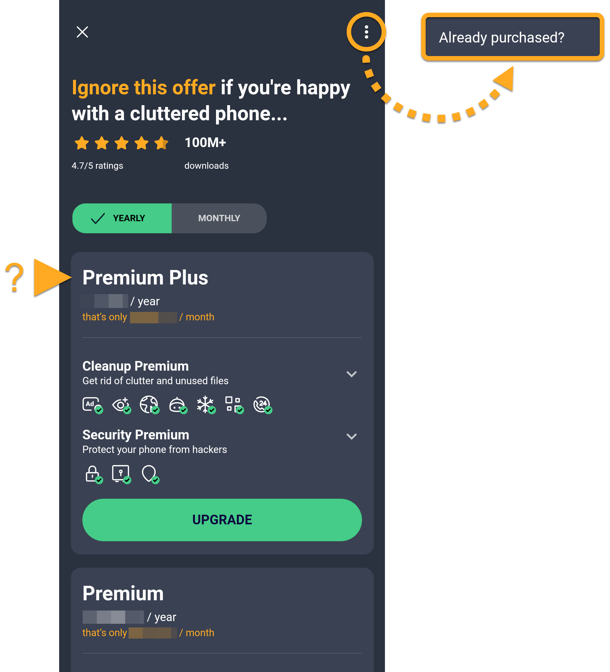 - Tap ⋮Options (the three dots) ▸ Already purchased?. Alternatively, if you have not purchased the subscription yet, select your preferred plan, then follow the on-screen instructions to complete the purchase.