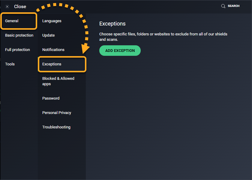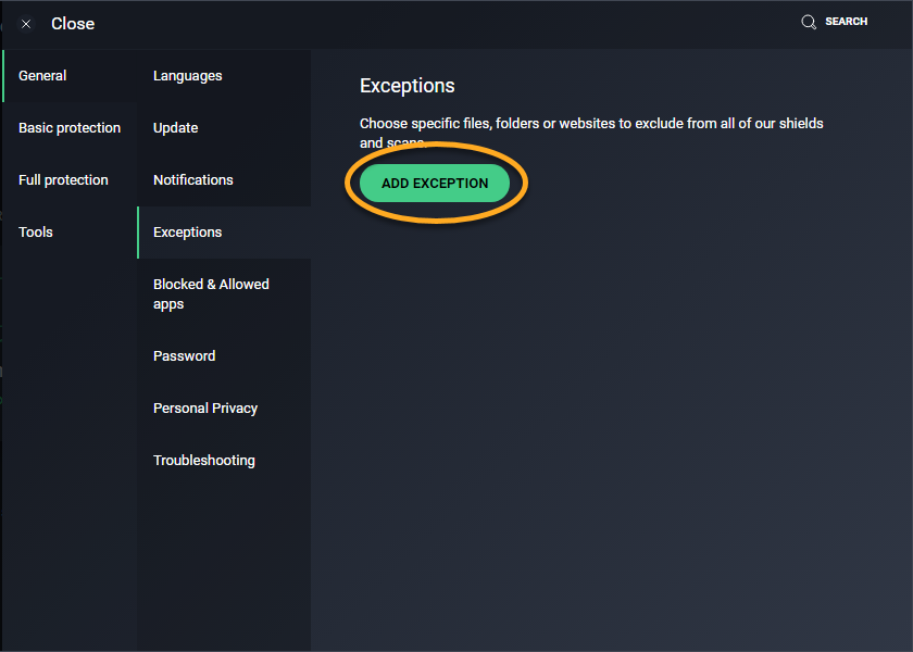 We do not recommend excluding files from any scan to ensure optimal protection for your PC. However, this option is available if you need to exclude a file temporarily for troubleshooting purposes. You can exclude certain files temporarily from all scans, shields, and CyberCapture at once: