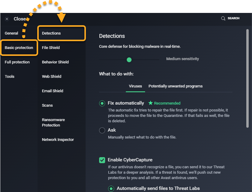 CyberCapture is now disabled. To enable it, go to ☰ Menu ▸ Settings ▸ Basic protection ▸ Detections and tick the box next to Enable CyberCapture.