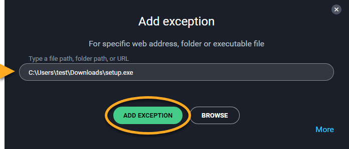 - Type the file path, folder path, or URL into the text box, then click Add Exception.