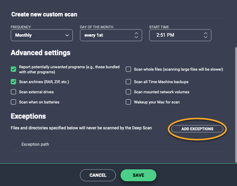 - If you want to exclude any files or folders from the scan, click Add exceptions, then select the relevant file or folder, and click Open.