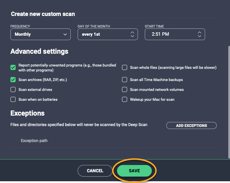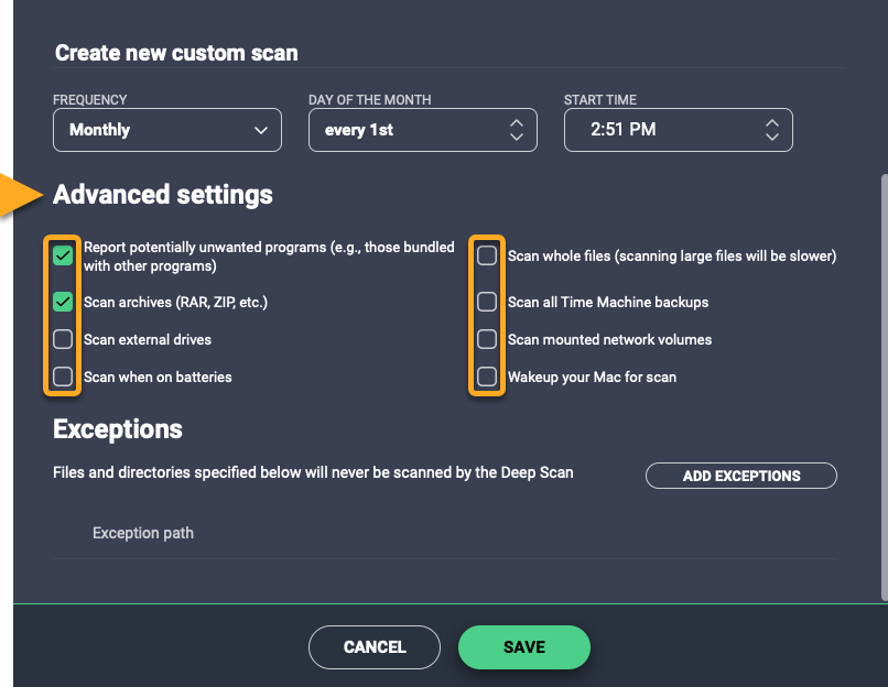 - Scan when on batteries: the scheduled scan runs even if your Mac is not plugged in.