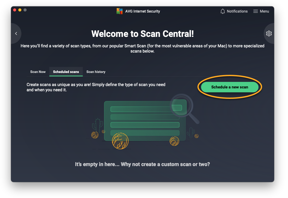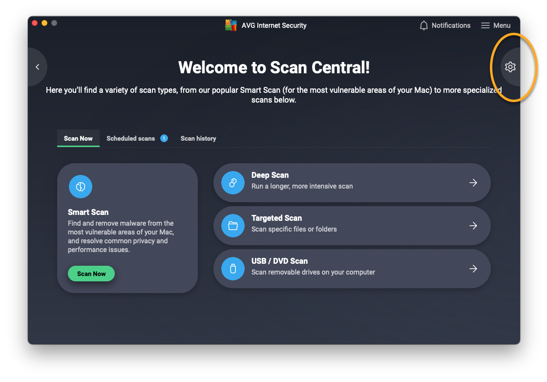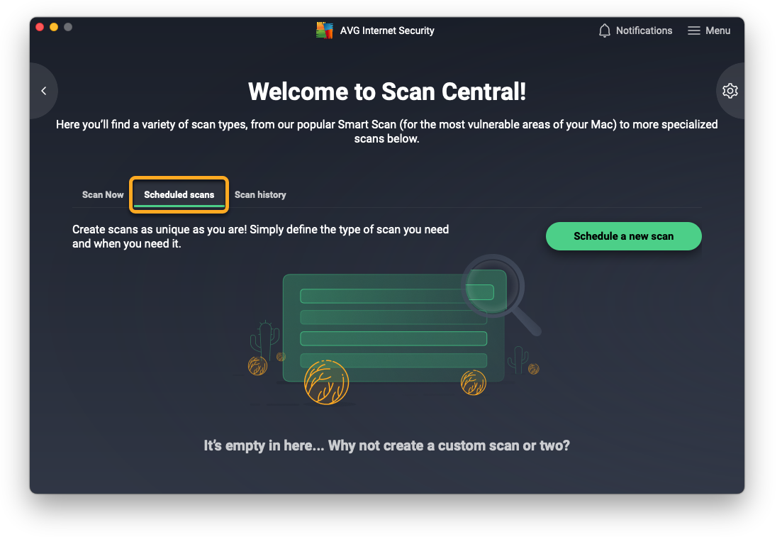 AVG AntiVirus and AVG Internet Security provide a range of scans to protect your Mac from malware and network threats. You can also create your own scheduled scans. The following virus scans are available: