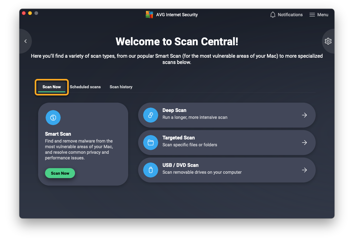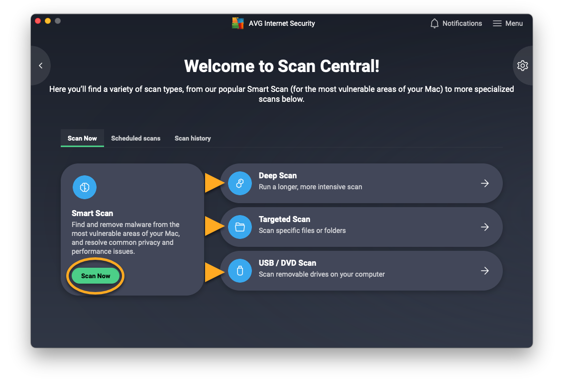 You can run any scan from the Scan Central screen. Follow the steps below to open Scan Central and run a scan: