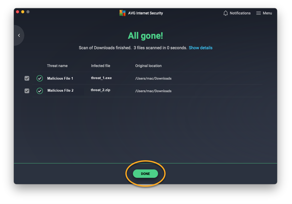 - After resolving the detected threats, or if no threats are found, click Done to return to the Scan Central screen.