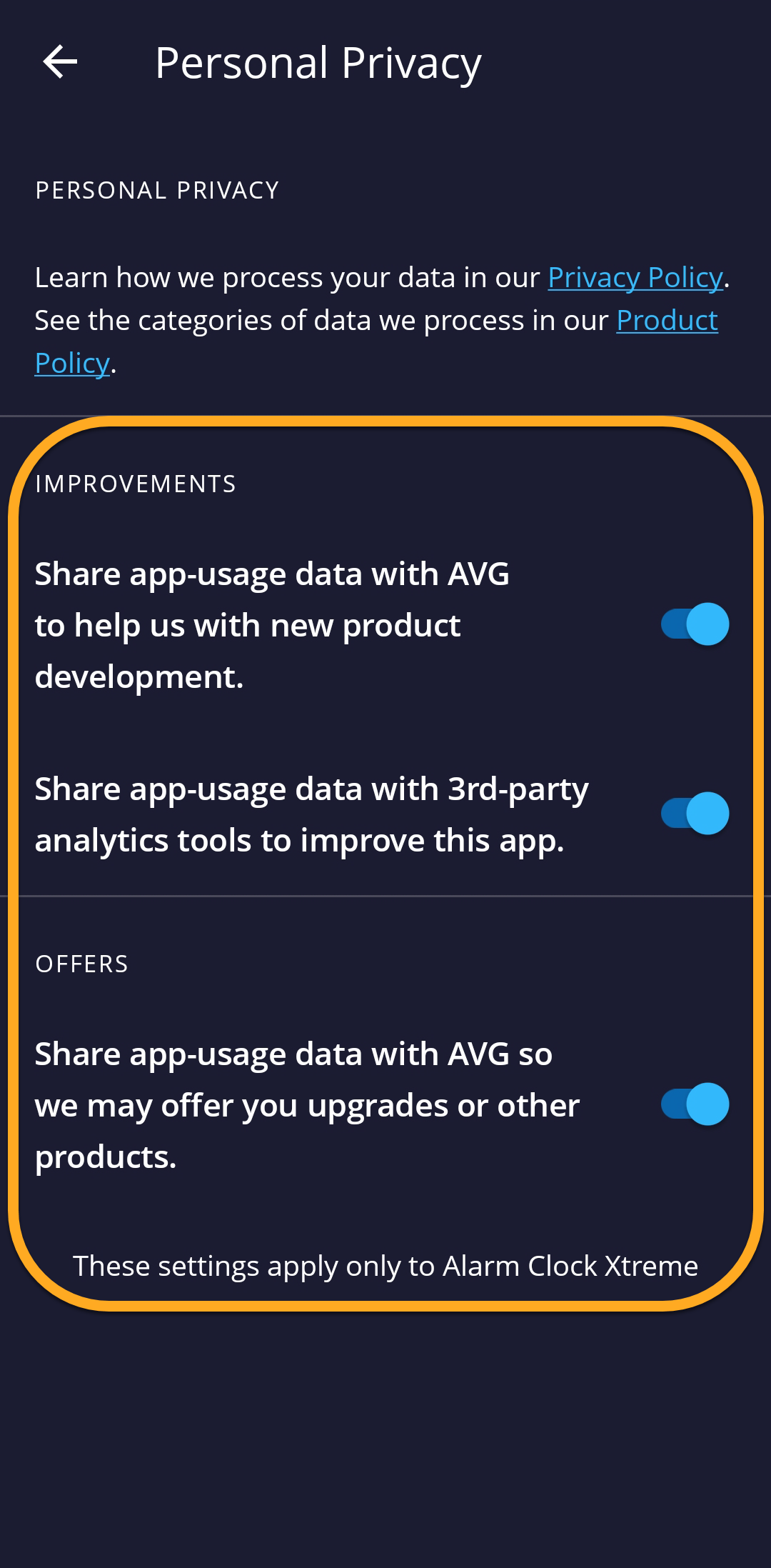 - Enable third party products offerings: Share App Usage data with AVG so we may offer you upgrades or our other applications.