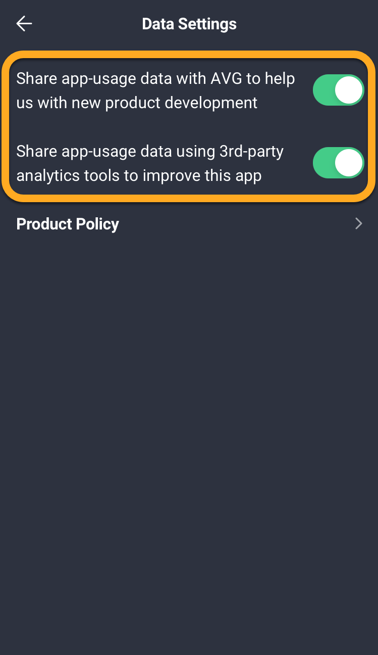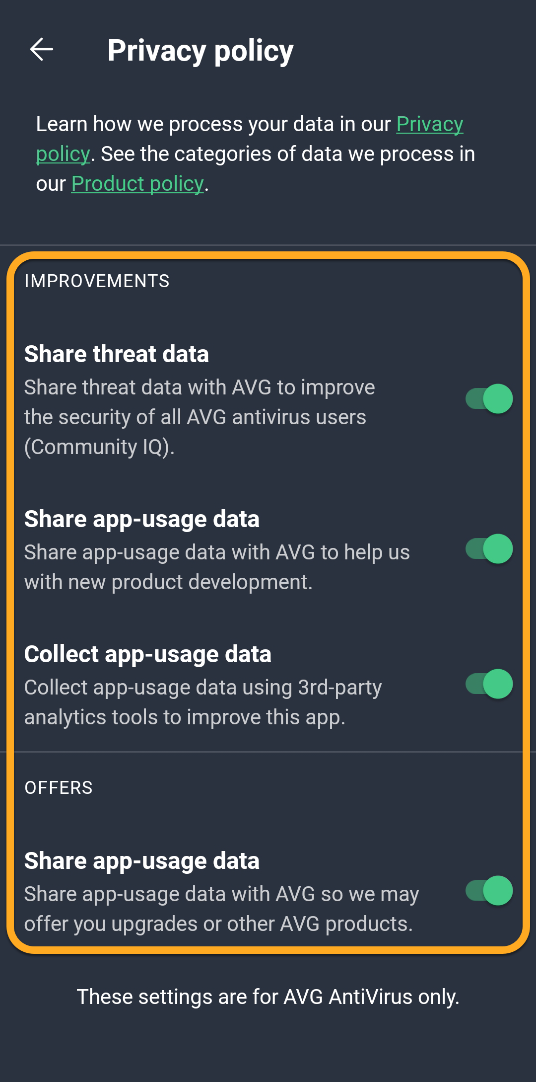 - Share app-usage data with AVG to help us with new product development: Share unidentifiable statistical data with AVG for the purpose of developing new applications.