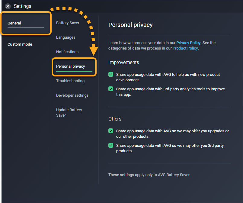 Your Personal Privacy settings are updated. For more details about data sharing, refer to the AVG Privacy Policy.