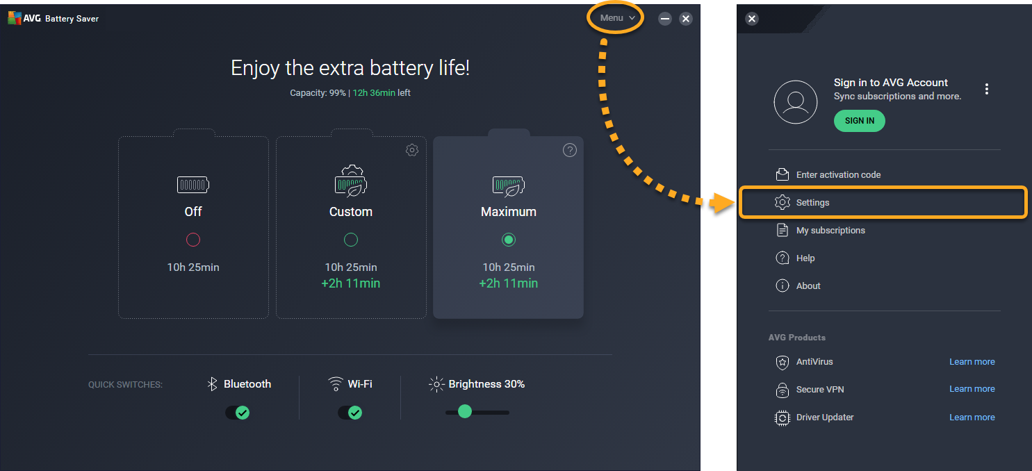 - Open AVG Battery Saver and go to Menu ▸ Settings.