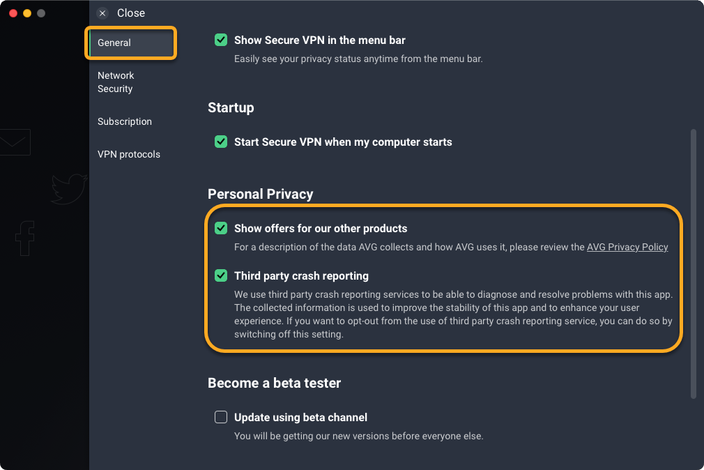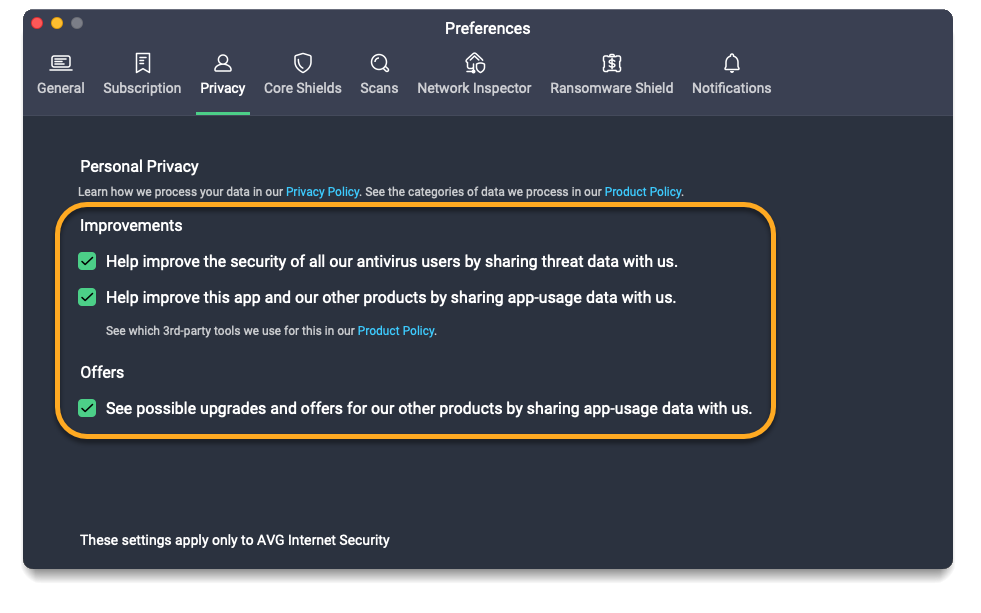 You can opt out of anonymous data sharing at any time. Refer to the relevant section(s) in this article for detailed instructions to manage privacy settings in AVG applications.