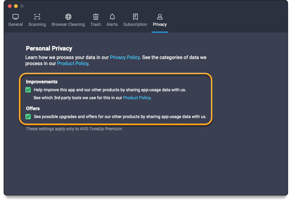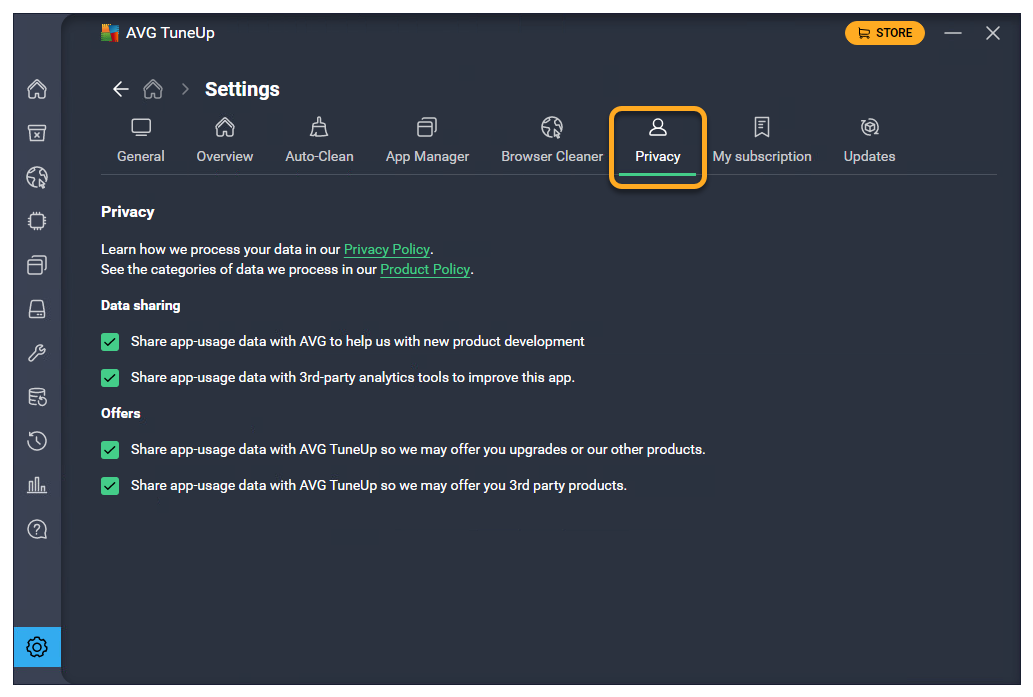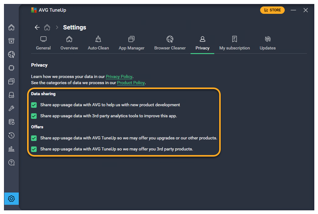 - Share app-usage data with 3rd-party analytics tools to improve this app: Contribute to anonymized analytical data that is used to examine how users interact with AVG TuneUp.
