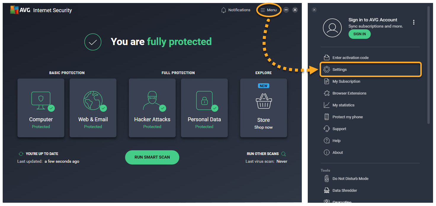 - Open AVG TuneUp, then hover your mouse over the side menu and select Settings.