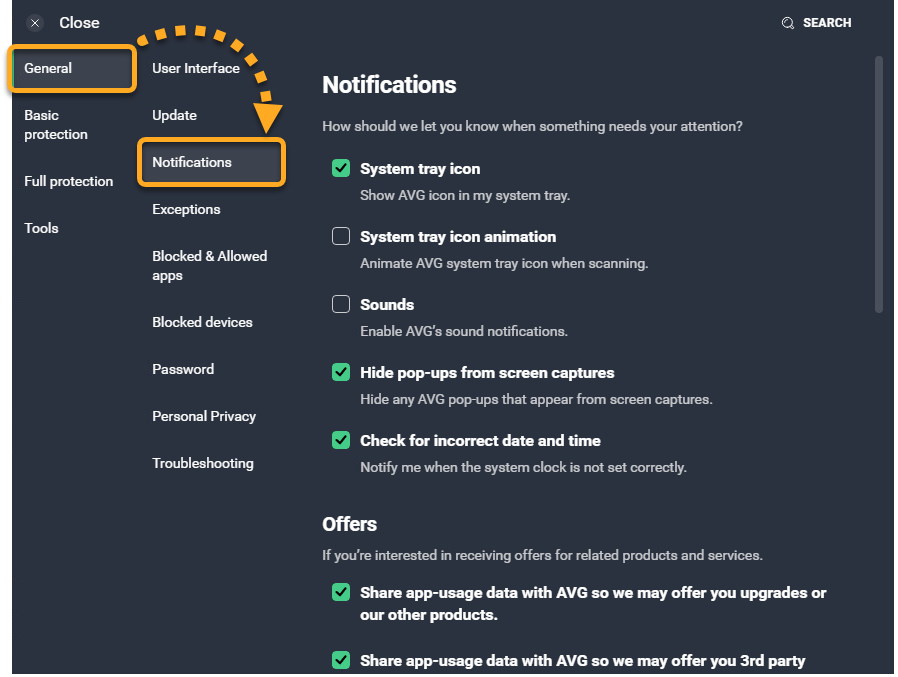 - On the AVG Antivirus Settings page, go to General ▸ Notifications.