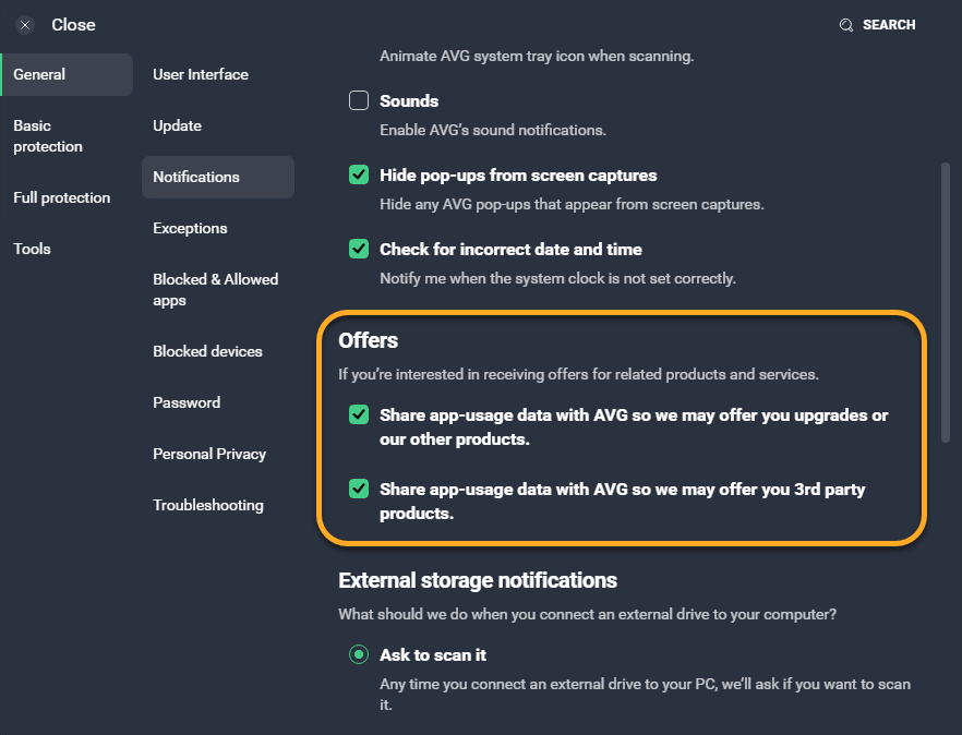 - See possible upgrades and offers for our other products by sharing app-usage data with us. In AVG AntiVirus, this option is enabled by default and does not appear.