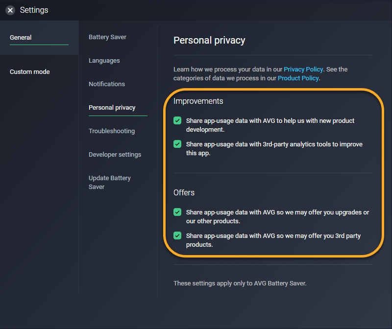 - Share app-usage data with 3rd-party analytics tools to improve this app: Contribute to anonymized analytical data that is used to examine how users interact with AVG Battery Saver.