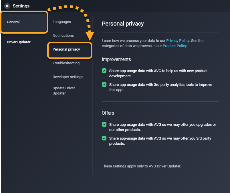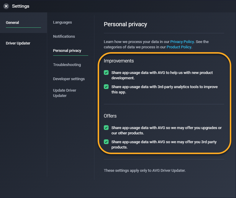 - Share app-usage data with 3rd-party analytics tools to improve this app: Contribute to anonymized analytical data that is used to examine how users interact with AVG Diver Updater.