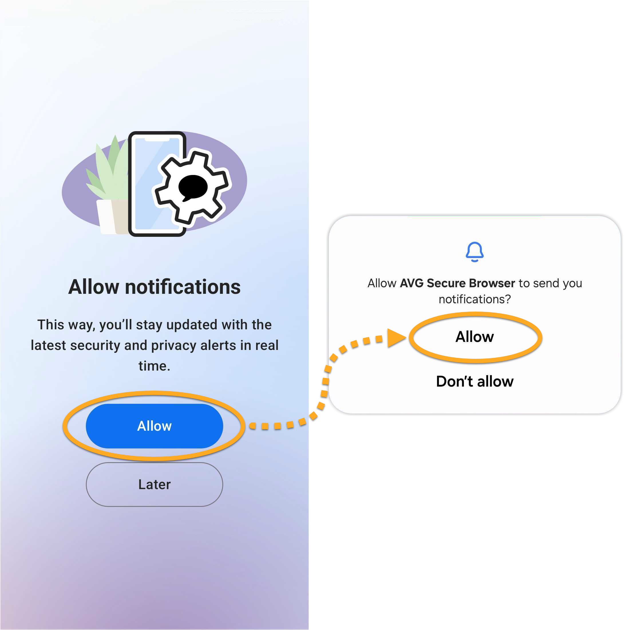 - Optionally, tap Allow twice to allow AVG Secure Browser to send you notifications.