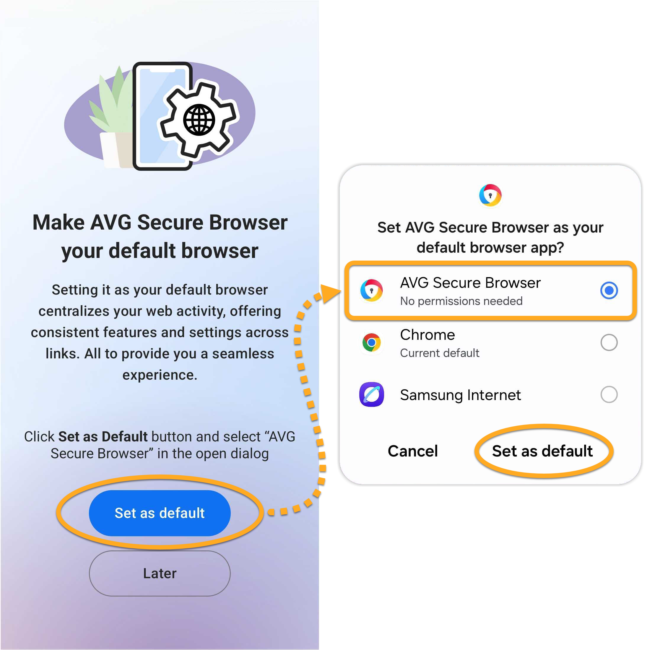- Optionally, tap Set as default, then tap the AVG Secure Browser panel, and tap Set as default again.