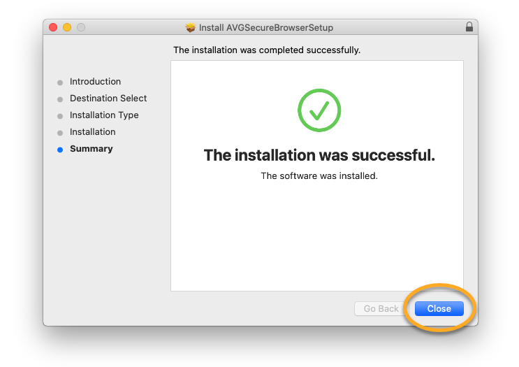 - Wait while setup installs AVG Secure Browser on your Mac, then click Close.