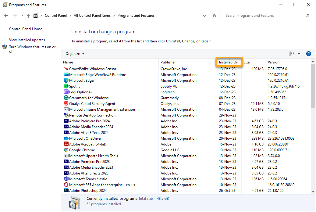 4. Click Installed On to sort the programs by the most recent date of installation.