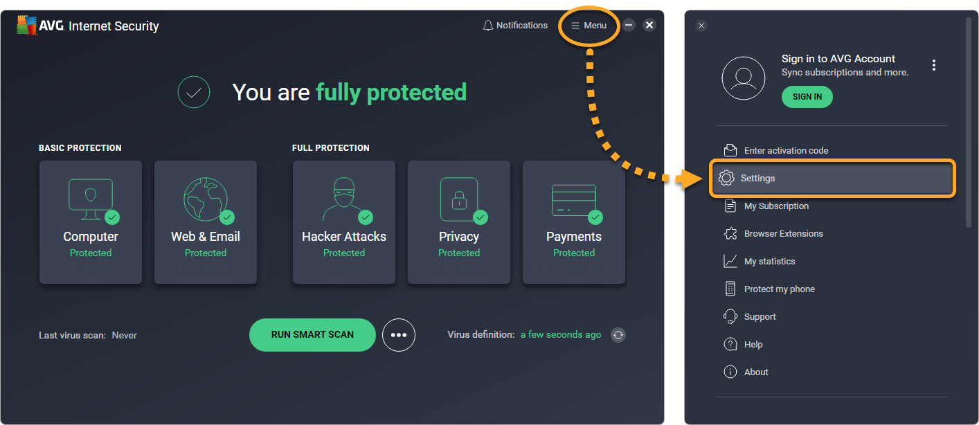 1. Open AVG Antivirus and go to MenuSettings.