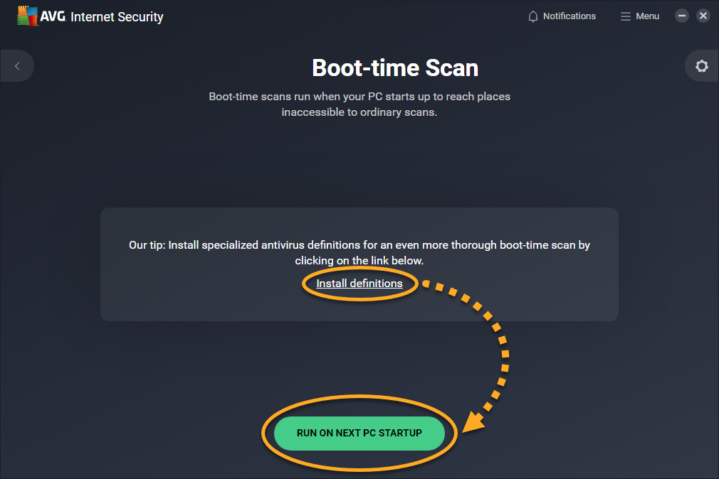 When you click Install definitions on the Boot-Time Scan screen, AVG Antivirus downloads all virus definitions from a cloud database. If you skip installing specialized definitions, Boot-Time Scan scans your PC based only on the last virus definitions that were downloaded. If Install definitions is not displayed on the Boot-Time Scan screen, your virus definitions are up to date.