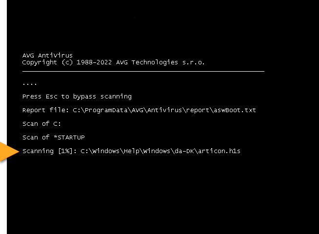 3. Restart your Windows PC. When the system restarts, a Boot-Time Scan progress screen appears. The scan usually takes several minutes, but the duration varies depending on the speed of your system and the number of files being scanned. To skip the scan, press the Esc key on your keyboard.