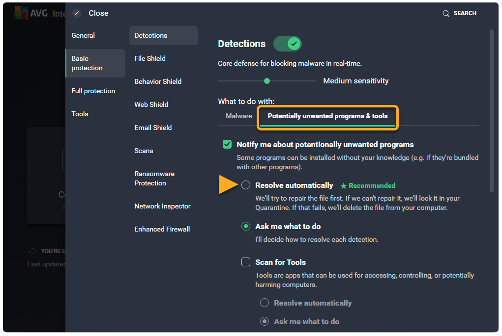 3. Under Potentially unwanted programs & tools tick the circle next to Resolve automatically to enable it.