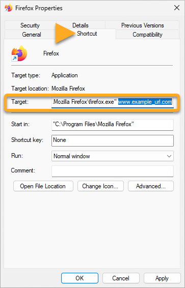 2. Ensure the Shortcut tab is selected. In the Target field, delete any unwanted URL.