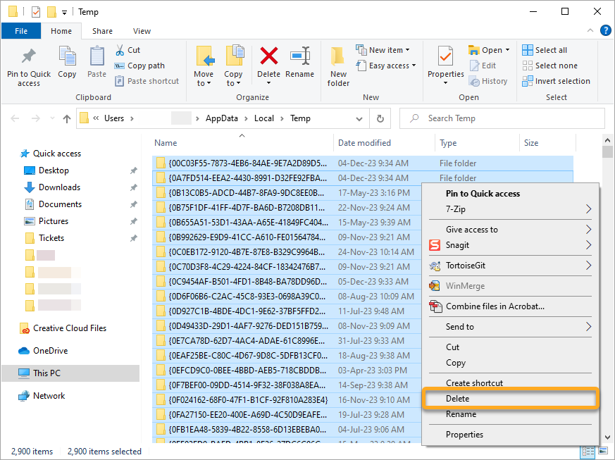 5. Right-click on the selected files and click Delete to delete all files in the temporary folder.