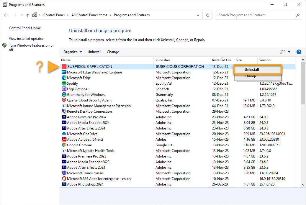 5. Uninstall any recently installed unknown programs from unknown publishers by right-clicking in the relevant program panel and selecting Uninstall.